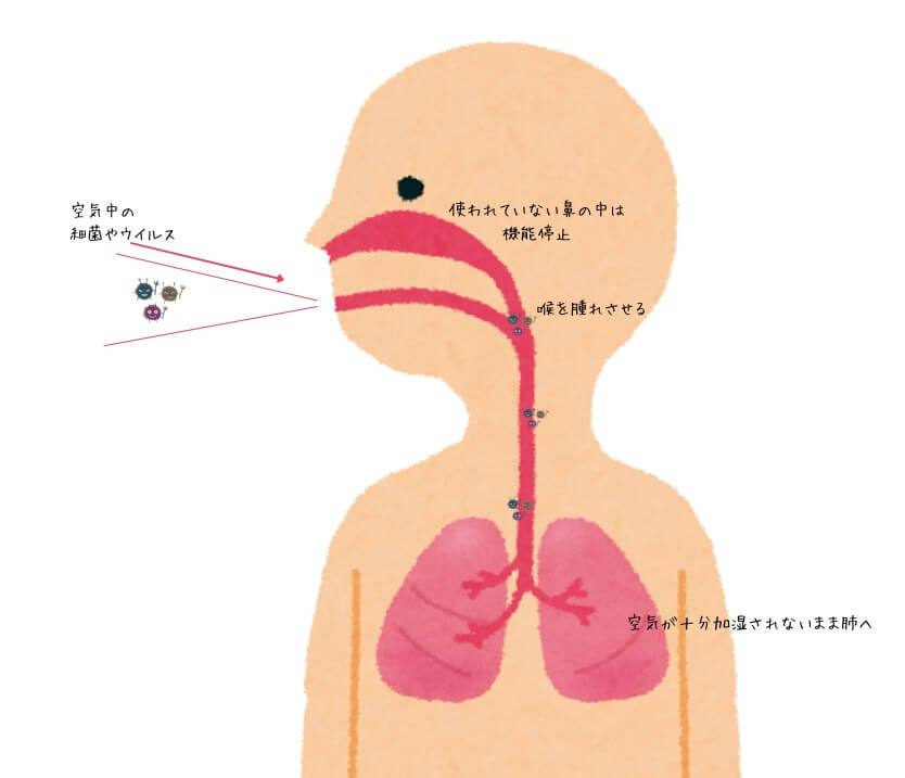 お口ポカンの状態だと口呼吸になってしまいます。この状態では空気中の細菌やウイルスを体内に入れてしまい感染症や喘息、肺炎が起こる原因になってしまいます。鼻に空気を通していないと鼻の中の機能が悪くなってしまいます。また、口の中が常に乾燥してしまうため、唾液の作用が弱まり、むし歯や歯肉炎などのトラブルを引き起こすことがあります。