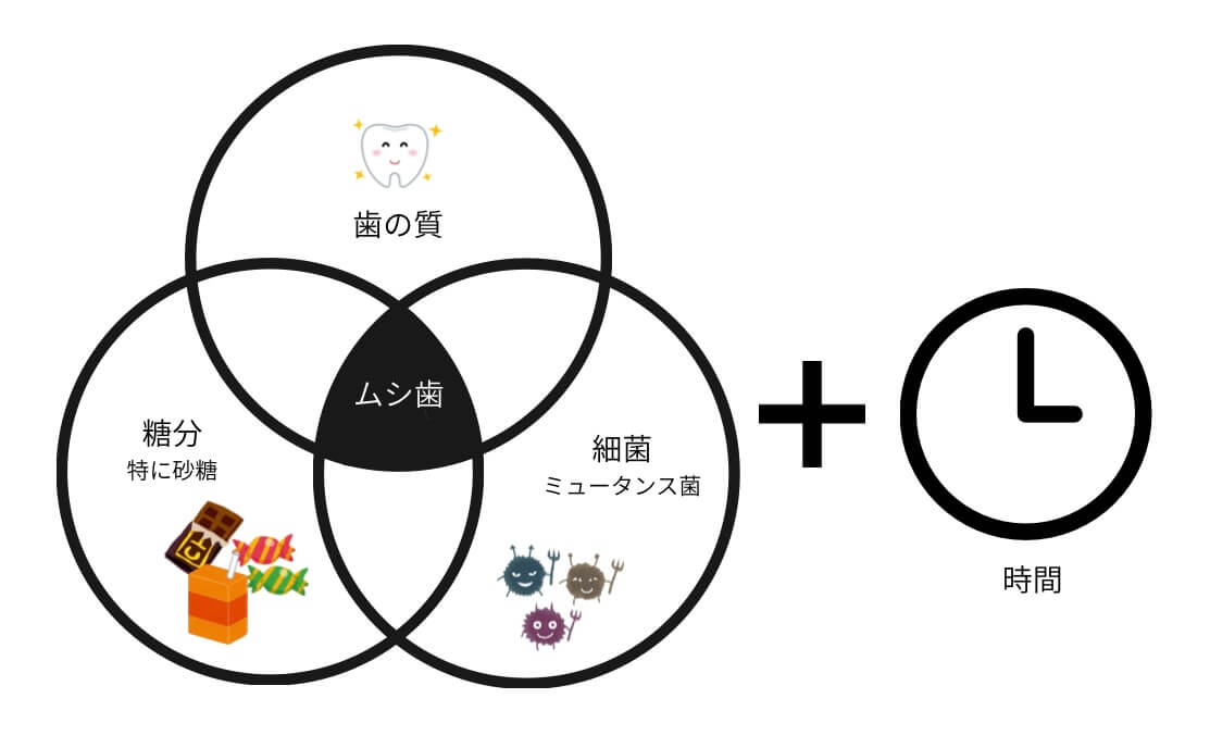 むし歯になる要因には、①〈歯の質〉が弱い、だ液の分泌が少ないことなどの体質、②むし歯に関わる〈細菌〉が多い、③細菌の栄養源となる〈糖分〉を頻繁にとる、④それに歯が酸にさらされる〈時間〉が長いことの4つがあり、要因が重なるとむし歯になります。