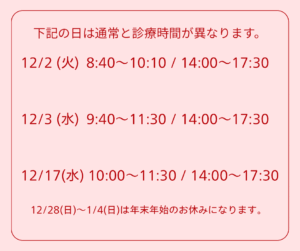 2025年12月 診療時間のお知らせ 2025.12.01 下記の日は診療時間が通常と異なります。 その他の日は通常通りの診療時間での受付となります。 Post Share Hatena Pocket RSS feedly Pin it クリスマス会🎄開催のお知らせ 前の記事